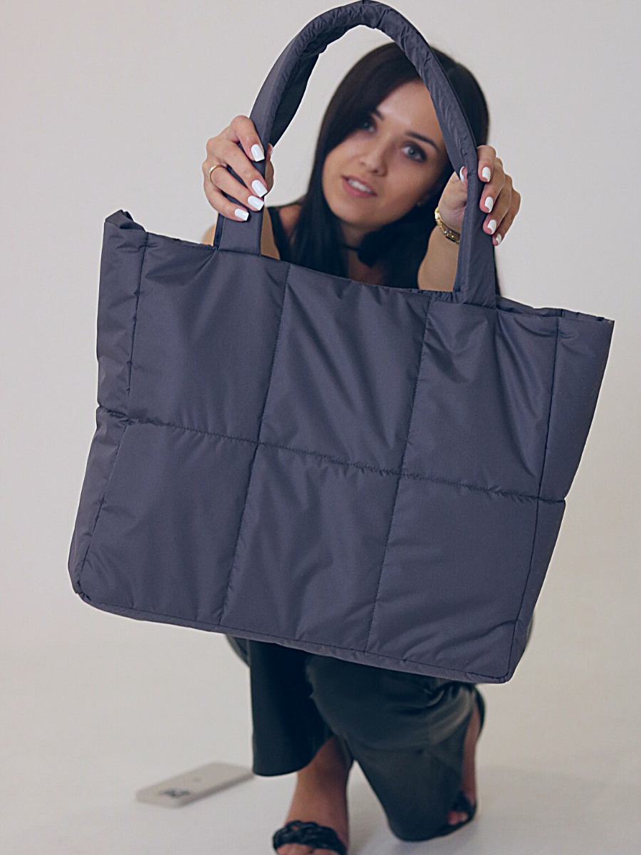 Сумка женская большая выполнена из водоотталкивающей ткани дюспо. Плащевый материал плотный, износостойкий. Шоппер для подростков прочный, выдерживает до 10 кг. Объемные квадраты прошиты цельным утеплителем, поэтому всегда будут держать форму. Тоут с мягкими широкими шлейками приятно носить на плече и в руках. Внутри одно вместительное отделение и внутренний карман на молнии.