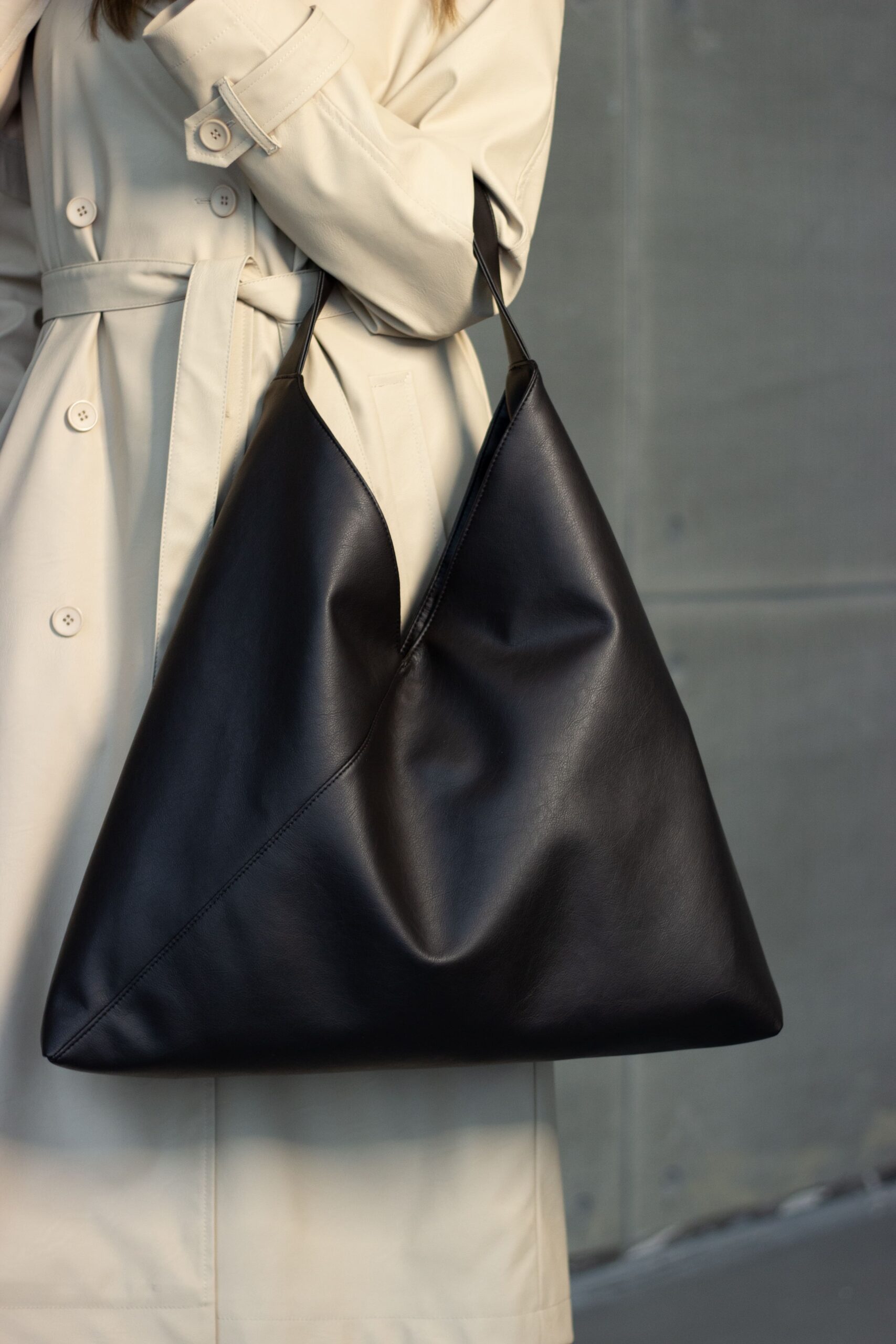 Вместительная средняя женская сумка мешок с необычным и оригинальным дизайном. У нее стильная длинная ручка на плечо, внутри одно отделение и дополнительный карман на молнии для документов или под телефон, смартфон. Сумка шоппер через плечо для женщин из экокожи станет отличным аксессуаром в любой период времени года, благодаря своей легкости практичности застежки на магните, а так же стильному минималистичному и строгому внешнему виду. Благодаря форме треугольника сумка подчеркнет красоту и утонченность. С ней вы будете отлично выглядеть в любой момент, будь то поход на работу, на учебу в школу или университет или ресторан. Сумочка дамская деловая эргономична и комфортна в носке на запястье или руке. Основное отделение прекрасно подойдет для ноутбука, планшета, ежедневника, документов, косметики. Премиальное качество экокожи, поможет вашей сумке прослужить долгий период времени, при этом она легко чистится.